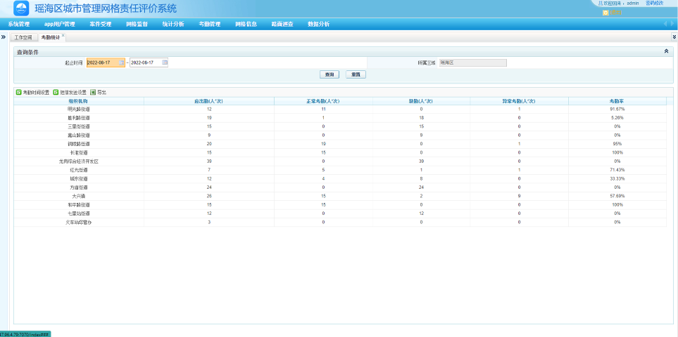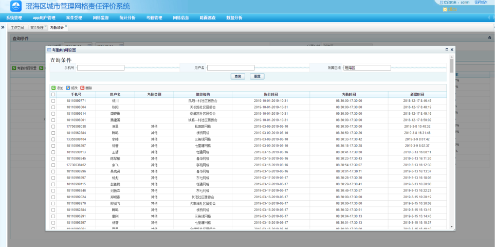 考勤管理: 包括考勤地图和考勤统计,是对辖区下的工作人员进行统一的管理。