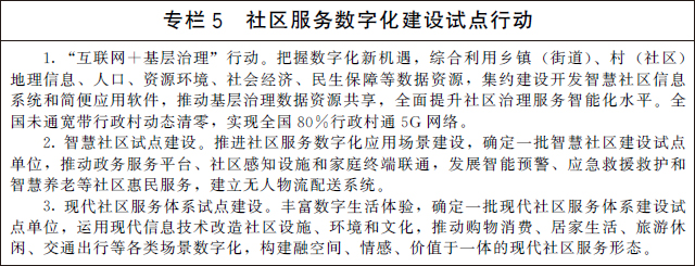 开发社区协商议事、政务服务办理、养老、家政、卫生、托育等网上服务项目应用,推动社区物业设备设施、安防等智能化改造升级。集约建设智慧社区信息系统,开发智慧社区移动应用服务,加速线上线下融合。推进数字社区服务圈、智慧家庭建设,促进社区家庭联动智慧服务生活圈发展。大力发展社区电子商务,探索推动无人物流配送进社区。推动“互联网+”与社区服务的深度融合,逐步构建服务便捷、管理精细、设施智能、环境宜居、私密安全的智慧社区。以县(市、区、旗)为单位,支持利用互联网、物联网、区块链等现代信息技术,深入组织开展智慧社区、现代社区服务体系试点建设,高效匹配社区全生活链供需,扩大多层次便利化社会服务供给。鼓励社会资本投资建设智慧社区,运用第五代移动通信(5G)、物联网等现代信息技术推进智慧社区信息基础设施建设。