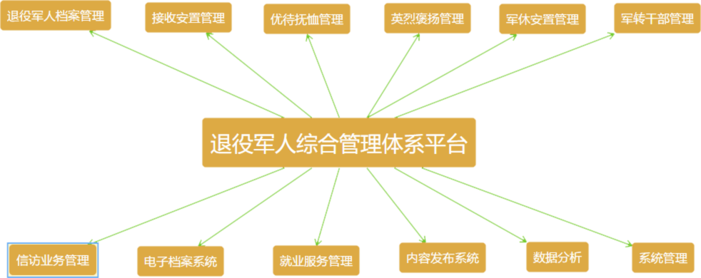 退役军人信息管理服务平台,主要包括五个业务子系统,分别是退役士兵接收安置管理、优抚对象信息管理、军转干部信息管理、军休干部信息管理、手机APP数据采集系统,主要功能是退役军人信息的数据填报、处理、跟踪、查询、分析和统计。