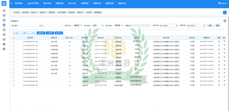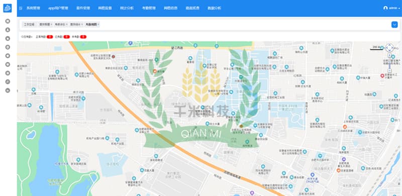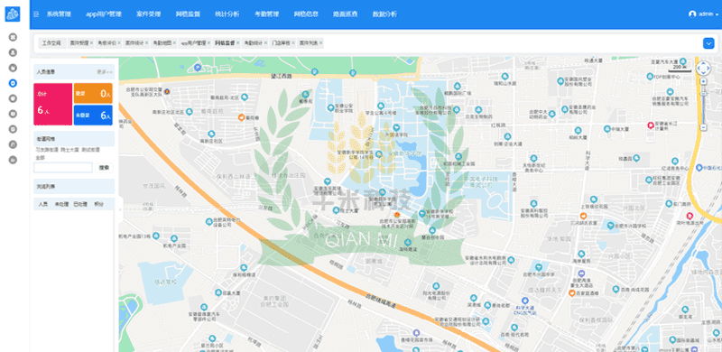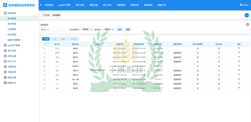 智慧城管综合管理系统:包括系统管理,app用户管理,案件受理,网格监督,统计分析,考勤管理,网格信息,路面巡查,数据分析