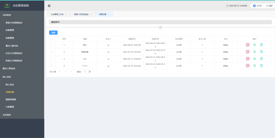 网上信访:包括信访申诉、民意征集、满意度调查三个模块,通过公众号进行意见反馈,在后台进行处置并公布。