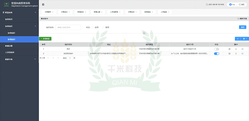 智慧协商管理系统,包括协商首页,协商组织,新建议题,人员信息库,数据字典等。