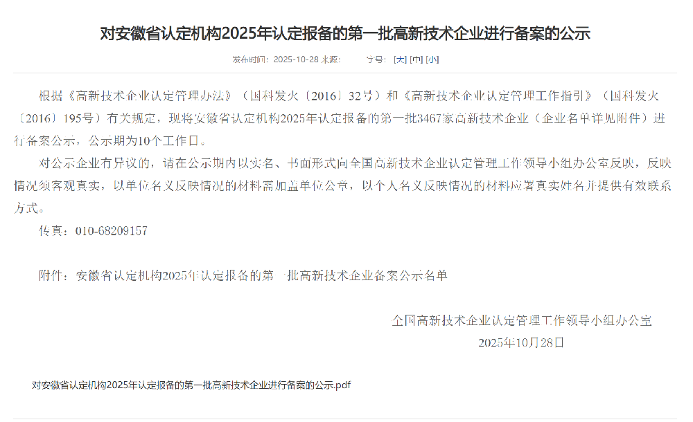 近日,全国高新技术企业认定管理工作领导小组办公室发布《对安徽省认定机构 2025 年认定报备的第一批高新技术企业进行备案的公示》,根据《高新技术企业认定管理办法》(国科发火〔201···