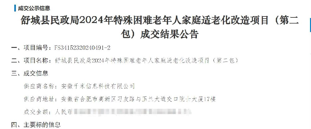 我司经过周密安排,精心准备,在23家投标企业中,脱颖而出,中标舒城县民政局适老化改造项目,项目目前已顺利实施,得到老人和业主的一致赞许; 成交公示信息 项目的顺利成交,验证了我司